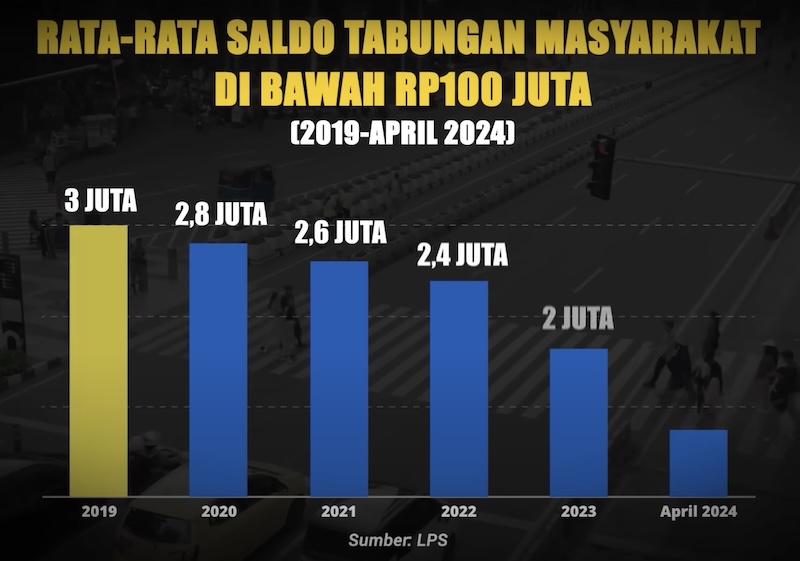 Berdasarkan laporan Lembaga Penjamin Simpanan (LPS), rata-rata saldo tabungan masyarakat Indonesia telah menurun drastis dalam lima tahun terakhir. Jika pada 2019 saldo tabungan rata-rata mencapai Rp3 juta, kini hanya tersisa Rp1,8 juta per April 2024—penurunan sekitar 40%. Kondisi ini menjadi cermin nyata dari kesulitan yang dialami oleh masyarakat dalam memenuhi kebutuhan sehari-hari. Mereka terpaksa menggunakan tabungan yang seharusnya digunakan untuk cadangan masa depan, hanya untuk bertahan hidup di tengah kondisi ekonomi yang semakin sulit.