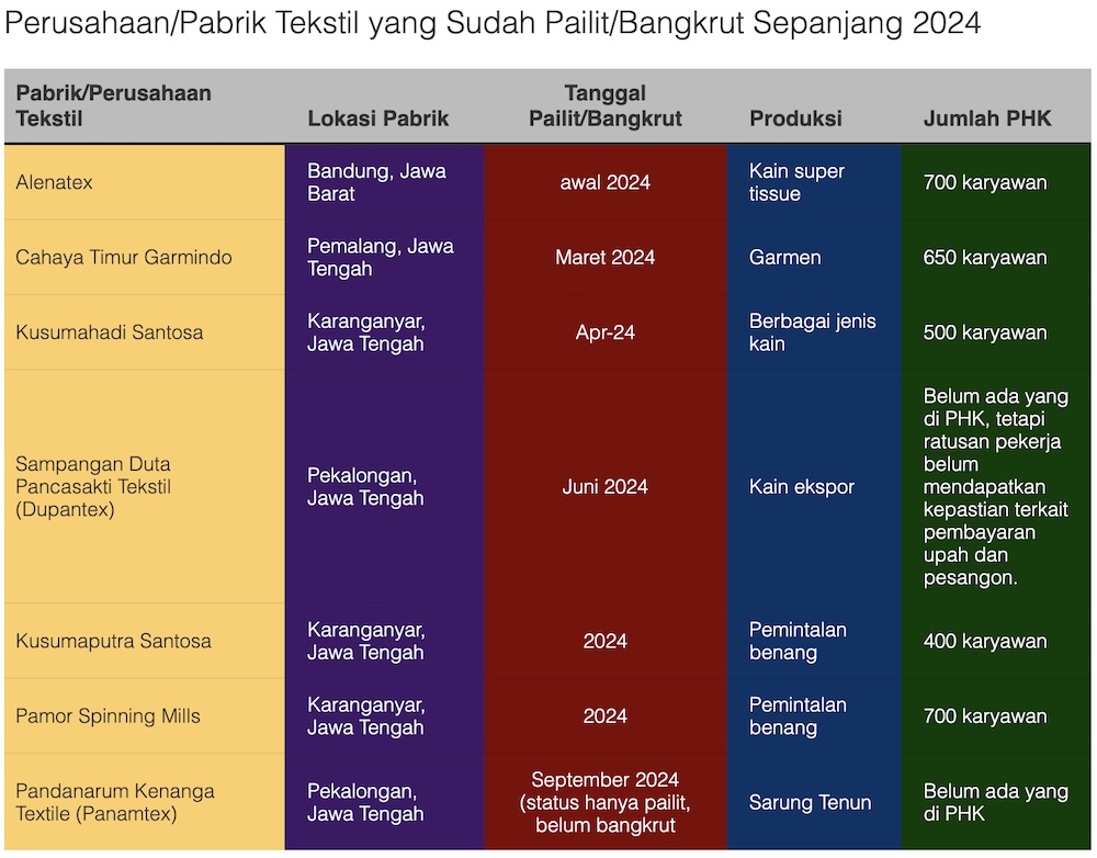 Pabrik tekstil yang dinyatakan pailit sepanjang 2024