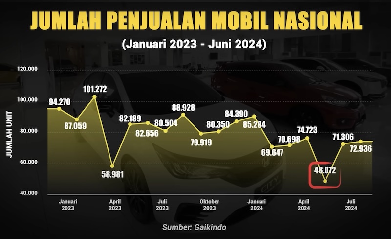 Penurunan daya beli juga dialami oleh kalangan menengah ke atas, yang terlihat dari anjloknya penjualan otomotif. Pada 2023, penjualan mobil nasional mencapai 70.000 unit per bulan, tetapi pada 2024, angka tersebut turun signifikan. Penurunan ini menjadi cerminan dari kesulitan yang dihadapi masyarakat dalam membelanjakan uang mereka, bahkan untuk kebutuhan yang biasanya menjadi simbol peningkatan taraf hidup.