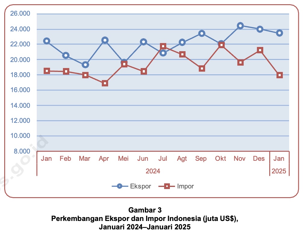 Pada Januari 2025, ekspor Indonesia mengalami pertumbuhan 4,8% dibandingkan bulan sebelumnya, didorong oleh peningkatan permintaan global terhadap komoditas utama seperti batu bara, minyak sawit, dan produk olahan nikel. China dan India tetap menjadi pasar utama ekspor Indonesia, sementara permintaan dari Eropa mengalami perlambatan akibat pelemahan ekonomi di kawasan tersebut.